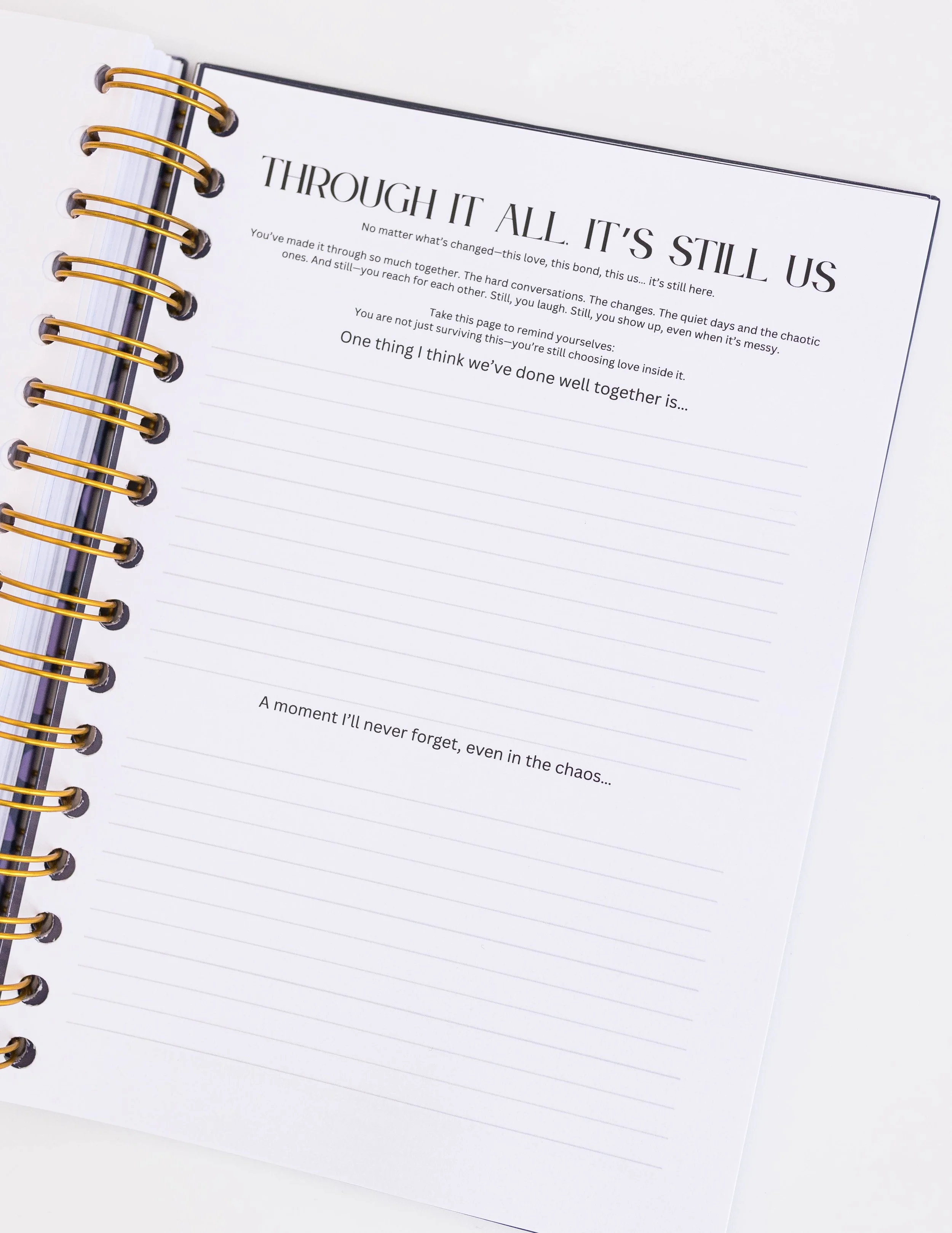 It’s a back-and-forth journal, meaning you each take turns responding to gentle prompts, sharing thoughts, fears, encouragement, or simply checking in.